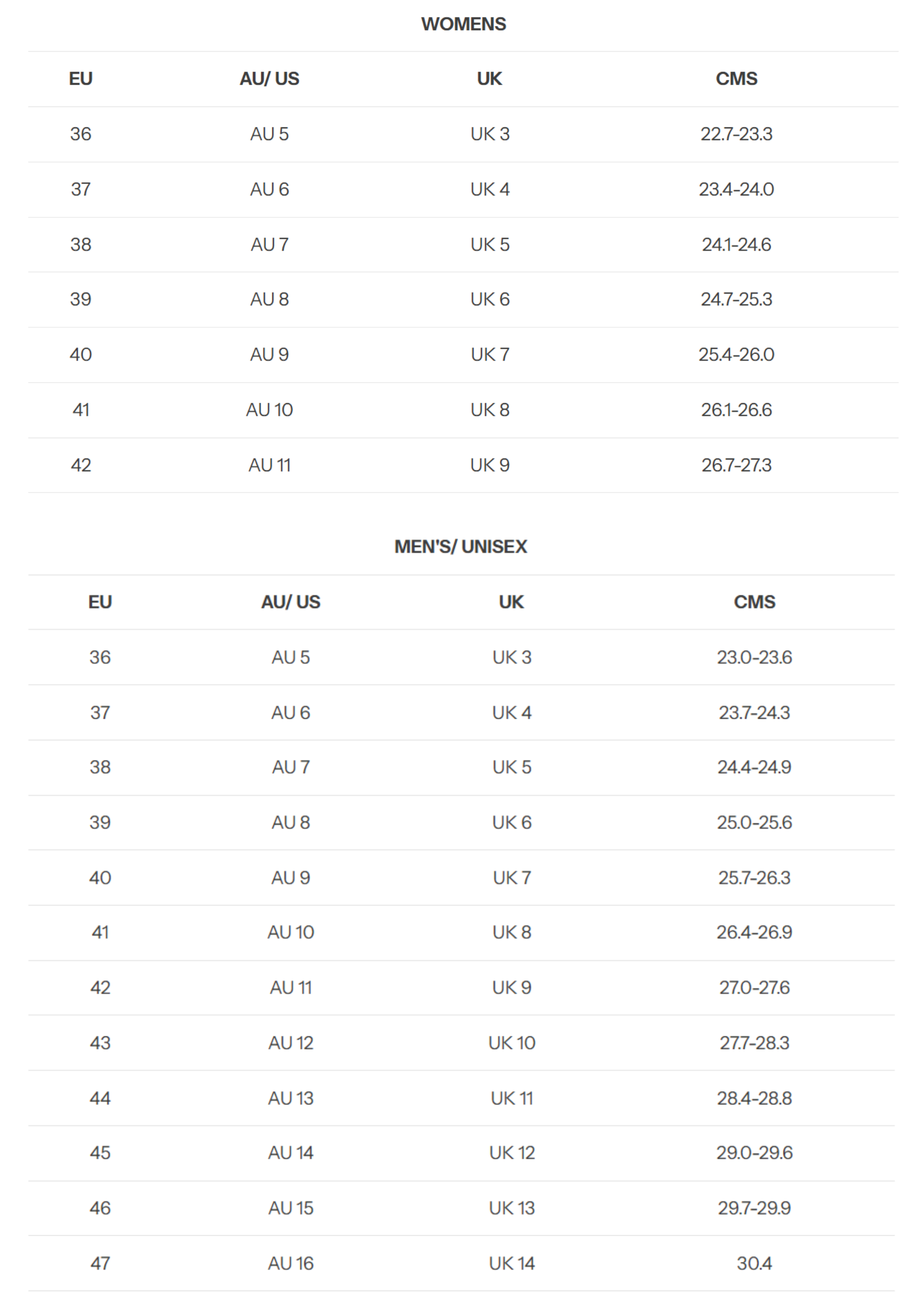 Please only refer to the below size guides as general sizing conversions. Please visit our sizing page for brand specific size charts here.